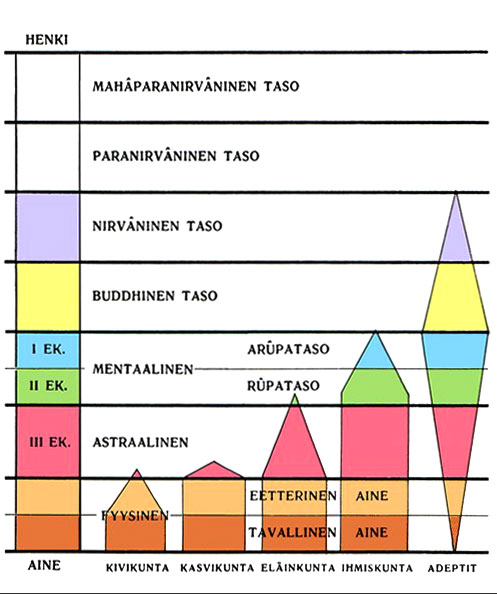 viittaavaa tekstikohtaa, kuva ilmaantuu näkyviin. I LUKUMiten näistä asioista saadaan tietoaIhminen on merkillisen monisyinen olento, ja hänen menneen, nykyisen ja vastaisen kehityksensä tutkiminen on ehtymättömän mielenkiintoista kaikille, jotka pystyvät näkemään ja ymmärtämään. Millaisia vaivalloisia ikuisuuksia hänen asteittainen kehityksensä nykyiselle asteelleen on vaatinut, mille askelmalle hänen kehityskulkunsa pitkillä portailla hän on tähän mennessä ehtinyt, mitä vastaisen kehityksen mahdollisuuksia meiltä tulevaisuuden esirippu peittää — nämä ovat kysymyksiä, jotka kaikkina aikoina ovat askarruttaneet kaikkia niitä, jotka yleensä ovat ollenkaan ajatelleet. Täällä länsimaissa ovat näihin kysymyksiin annetut vastaukset olleet monet ja moninaiset. On esitetty monta dogmaattista väitettä, jotka on pohjattu ns. ilmoituksen erilaisiin tulkintoihin; on esitelty monta nokkelaa spekulatiivista teoriaa, jotka useissa tapauksissa ovat olleet syvällisen metafyysisen ajattelun tulosta. Nuo dogmaattiset väitteet vaativat meitä usein uskomaan ilmeisiä mahdottomuuksia, kun taas länsimainen spekulatiivinen ajatus liikkuu suurimmaksi osaksi materialistisia raiteita pitkin. Kumpikaan, dogmatismi ja spekulatiivinen ajatus, ei lähesty puheenaolevia kysymyksiä käytännölliseltä näkökulmalta asioina, joita voidaan tutkia, kuten kaikkia muitakin tieteen kysymyksiä. Teosofia esiintyy teorioin, jotka lepäävät kokonaan toisenlaisilla perustuksilla. Pyrkimättä ollenkaan halventamaan siitä tietoa, jota saavutetaan muinaisia pyhiä kirjoja tutkimalla tai filosofisen pohdinnan avulla, pitää se kuitenkin ihmisen rakennetta ja kehitystä yksinkertaisen tutkimuksen eikä pelkän spekulatiivisen ajatuksen asioina — tosiasioina, eikä hämärien teorioiden epämääräisinä otaksumina. Teosofian toteamukset ovat aivan selvät: ihmisen menneisyyttä, nykyisyyttä ja tulevaisuutta voidaan tutkia ensi käden lähteistä ja siihen pystyy jokainen, joka on ottanut vaivakseen siihen valmistautua. Näin tutkittuina ne osoittautuvat suurenmoisen suunnitelman osiksi — suunnitelman, joka on johdonmukainen ja helposti käsitettävä, joka, samalla kun se pitää yhtä monien vanhojen uskontojen opetusten kanssa ja selittää niitä, ei kuitenkaan ole mitenkään niistä riippuvainen, se kun kohta kohdalta voidaan todeta käyttämällä sisäisiä kykyjä, jotka kylläkin ovat vielä salattuja ihmiskunnan enemmistöltä, mutta joita kuitenkin on jo oppinut käyttämään melkoinen joukko tutkijoitamme. Ihmisen menneisyyteen nähden teosofiset opit eivät nojaudu vain varhaisempien uskontojen välittämän perimätiedon yksimieliseen todistukseen, vaan myös erääseen luotettavaan aikakirjaan — aikakirjaan, jota voi nähdä ja tutkia jokainen, jolla on selvänäköä siinä määrin, että voi tajuta sen hienosyisen aineen värähdykset, johon tuon aikakirjan muistimerkit ovat painetut. Ihmiskuntaa odottavaan tulevaisuuteen nähden teosofiset opit nojautuvat ensiksikin loogisiin johtopäätelmiin tähänastisen kehityksen luonteesta, toiseksi sellaisilta ihmisiltä saatuihin tietoihin, jotka jo ovat saavuttaneet kehitysasteet, jotka useimmille meistä siintävät läheisemmässä tai kaukaisemmassa tulevaisuudessa, ja kolmanneksi vertailuihin, joita voi tehdä jokainen, jolla on mahdollisuus nähdä korkealle kehittyneitä ihmisiä heidän eri kehitystasoillaan. Voimme ottaa esimerkiksi lapsen, joka ei muusta tuntisi luonnon kulkua, mutta joka kuitenkin saattaa päätellä tulevansa kasvamaan aikuiseksi sen tosiasian nojalla, että hän on jo kasvanut erääseen mittaan ja eräällä tavalla ja että hän näkee ympärillään toisia lapsia ja nuoria, kaikkia lapsuuden ja aikuisiän välisiä kehitysasteita. Ihmisen nykyisen olotilan tutkimista, hänen kehityksensä välittämiä apuneuvoja ja hänen ajatustensa vaikutusta tähän kehitykseen pitää teosofinen tutkija asioina, joihin on laajana yleisenä periaatteena sovellettava eräitä hyvin tunnettuja lakeja, sitten on huolellisesti tutkittava ja kärsivällisesti vertailtava monia tapauksia saadaksemme selville noiden lakien vaikutuksen yksityiskohdat. Näiden asioiden tutkimiseen tarvitaan itse asiassa vain näkökykyä, ja tämä kirja julkaistaankin siinä toivossa, että se ensiksikin auttaisi niitä vakavia opiskelijoita, joilla ei vielä ole tuota näkökykyä, tajuamaan, miltä sielu ja sen käyttövälineet näyttävät sen avulla tutkittuina; että se toiseksi auttaisi niitä jo hyvin lukuisia henkilöitä, jotka paraikaa opettelevat käyttelemään tuota näkökykyä, ymmärtämään näkemänsä merkitystä. Minä olen hyvinkin tietoinen siitä, että maailma yleensä ei vielä ole vakuuttunut selvänäön olemassaolostakaan; mutta minä myös tiedän, että kaikki ne, jotka ovat asiaa tosissaan tutkineet, ovat havainneet todisteet sen puolesta kiistämättömiksi. Jos kuka tahansa tavallisillakaan lahjoilla varustettu henkilö ottaa vaivakseen lukea ne oikeiksi todistetut kertomukset selvänäöstä, jotka olen esittänyt Selvänäkö-nimisessä kirjassani, ja jos hän vielä tutustuu niihin kirjoihin, joista ne ovat valikoidut, niin hän on heti oivaltava, että on olemassa valtava määrä kumoamattomia todisteita tämän kyvyn puolesta. Niistä taas, jotka pystyvät itse näkemään ja jotka joka päivä käyttävät tätä korkeampaa näkökykyään tuhansilla eri tavoilla, näyttävät tietämättömän enemmistön yritykset kieltää tämä kyky naurettavilta. Selvänäköisen mielestä ei sen kanssa kannata väitellä. Jos jokin sokea alkaisi väitellä kanssamme tavallisesta fyysisestä näöstä, väittäen, että olemme harhakäsityksen vallassa uskoessamme omaavamme tuon kyvyn, me luultavastikaan emme katsoisi kannattavan sen enempää kiistellä näkökykymme puolesta, vaan sanoisimme vain: "Minä varmasti näen, minkä vuoksi on turhaa koettaa saada minut vakuutetuksi, etten 